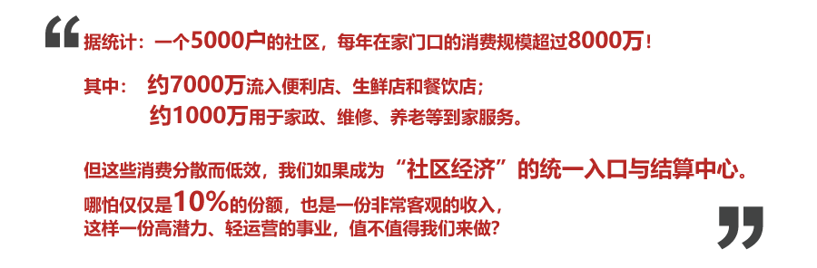 | 您已经在业主群、邻里圈拥有天然的信任关系,推广接受度极高,避免了陌生推广的被拒和冷启动难题。 | ||