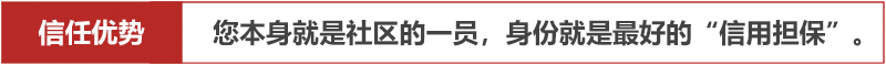 | 邻居们更愿意相信您推荐的商品和服务,因为"跑得了和尚跑不了庙",转化率远高于外部平台。 | ||